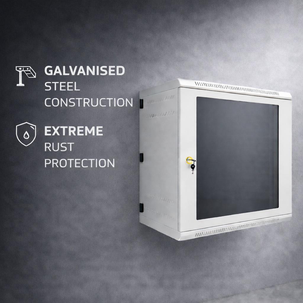 Available from 6U to 21U in 600 mm width with 400 mm or 550 mm depth options, these enclosures accommodate standard 19″ rack-mount networking switches, patch panels, media converters, small UPS units, and AV equipment. Every cabinet includes wall-mounting hardware, a vented top panel with cable entry, and access to a full range of complementing accessories including shelves, fan units, PDUs, and blanking panels. Constructed from galvanised steel for extreme corrosion resistance — no rusting at weld points, no degradation in humid environments — with powder coat finish in standard or custom RAL colours.